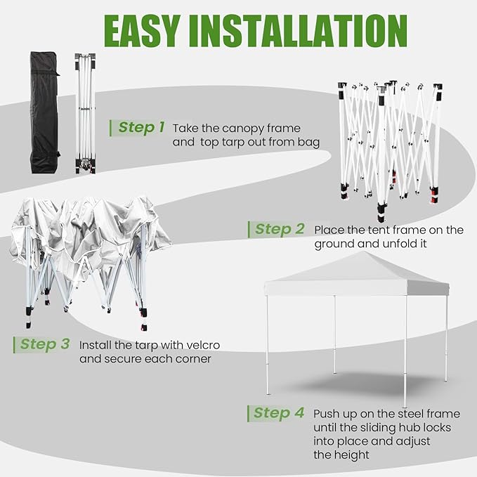 - Easy Up Canopy: This pop up tent can be assembled or packed in 5 minutes by its pop up design. Lightweight assembly design avoids the hassle of traditional tents, giving you more time to enjoy your activities. With three adjustable height settings, this canopy tent offers versatile options for any outdoor occasion, like camping or parties