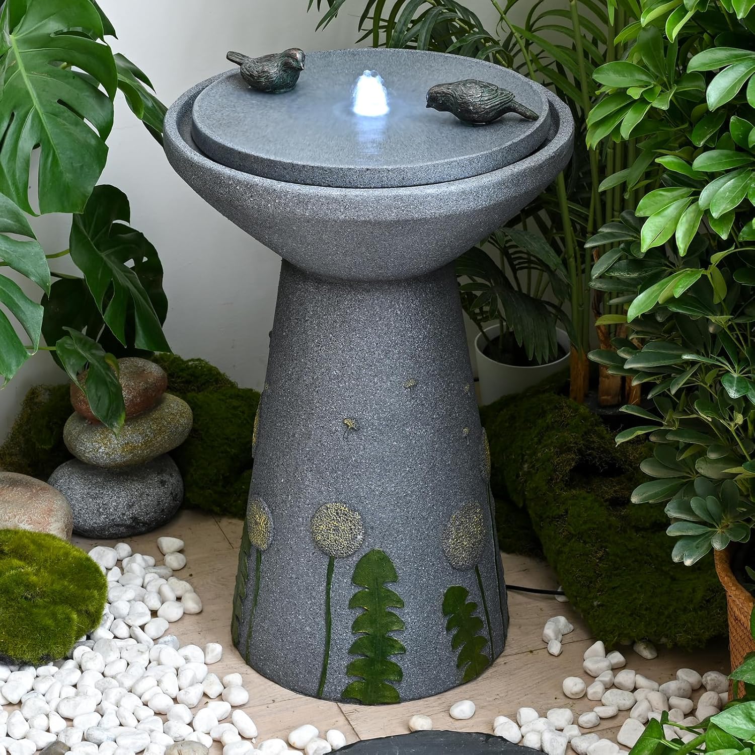 - Soft-Glow LED Lights: Equipped with built-in LED lights, this fountain illuminates your garden or patio, creating a mesmerizing ambiance for garden dinners or quiet evenings. Making it ideal for creating a relaxing atmosphere as night falls.