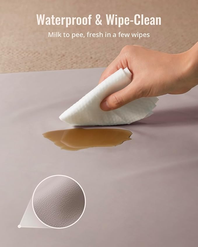 - Waterproof and Wipe-clean: Unlike many other mats that absorb spills, our vegan leather baby play mat is 100% waterproof and easy to clean. Simply wipe away food, milk spills, or other messes to keep your baby's play area spotless and hygienic