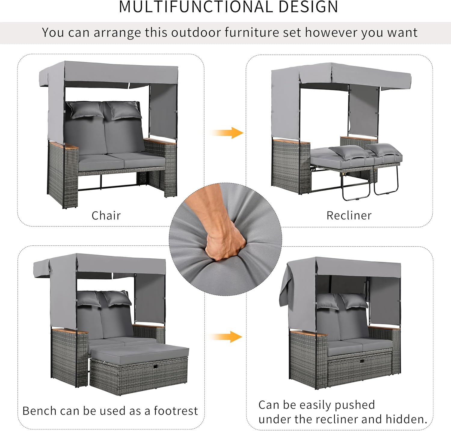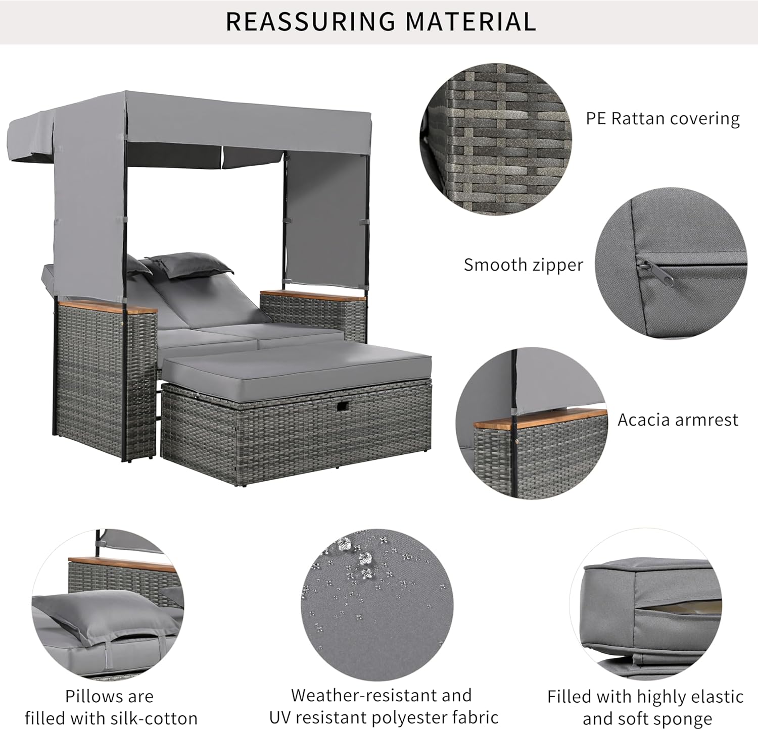 Merax 2-Piece Outdoor Rattan Daybed, Wooden Handrail Table Patio Loveseat Sofa Bed with Bench Lounge Roof Set and Cushions for Poolside, Backyard and Garden, Grey