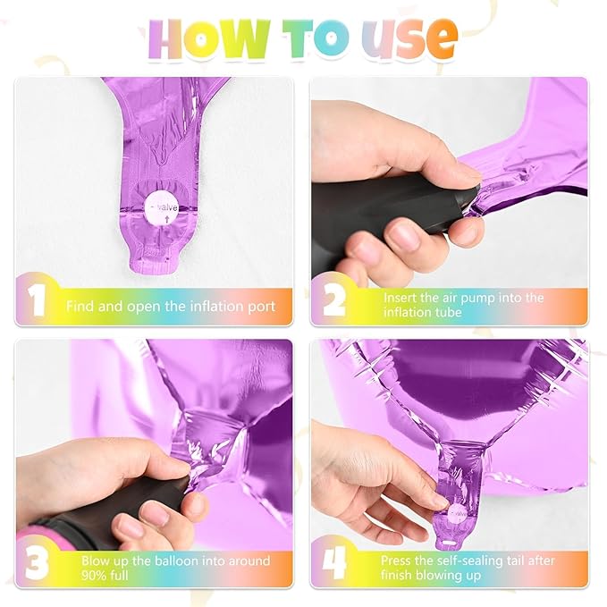 - 【EASY TO INFLATE】 Inflating these metallic rainbow foil balloons is effortless! Simply fill them with air or helium, then pinch the inflation valve to seal automatically—no extra tools required.