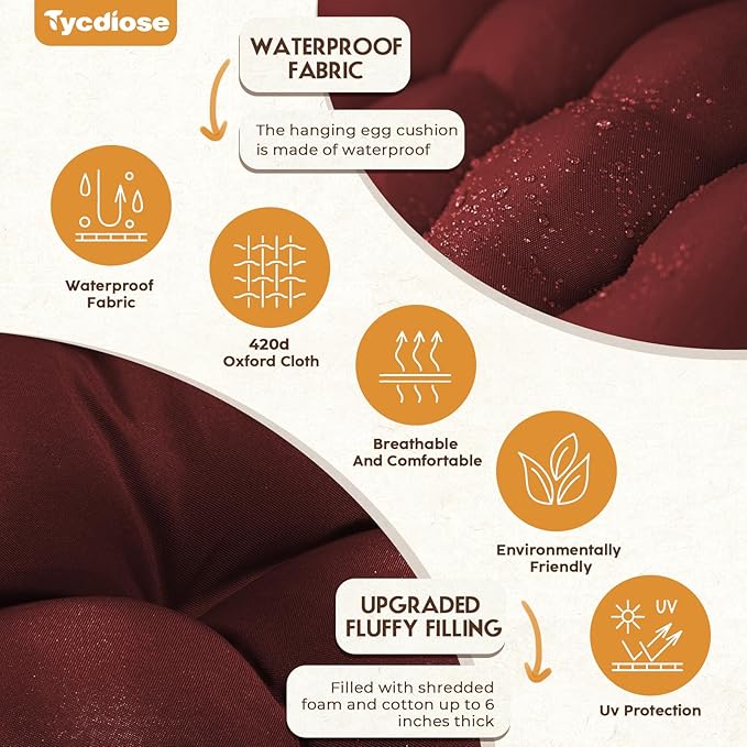 - 🛒【WATERPROOF FABRIC】-Tycdiose egg chair cushion is made of waterproof, UV-resistant Oxford fabric, which is soft and skin-friendly, durable and suitable for indoor outdoor patios, garden porches and sunrooms. Note: If rainwater stays on the 3D seams (grooves) of the egg chair cushion for a long time, it may seep in and wet the egg chair cushion.