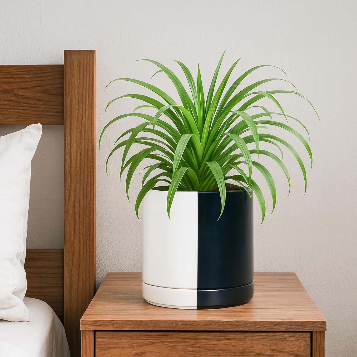 D'vine Dev 6.5 Inch Ceramic Planter Pot with Drainage Hole and Saucer, Indoor Cylinder Round Planter Pot, Split Monochrome Black & White, 94-O-C-0