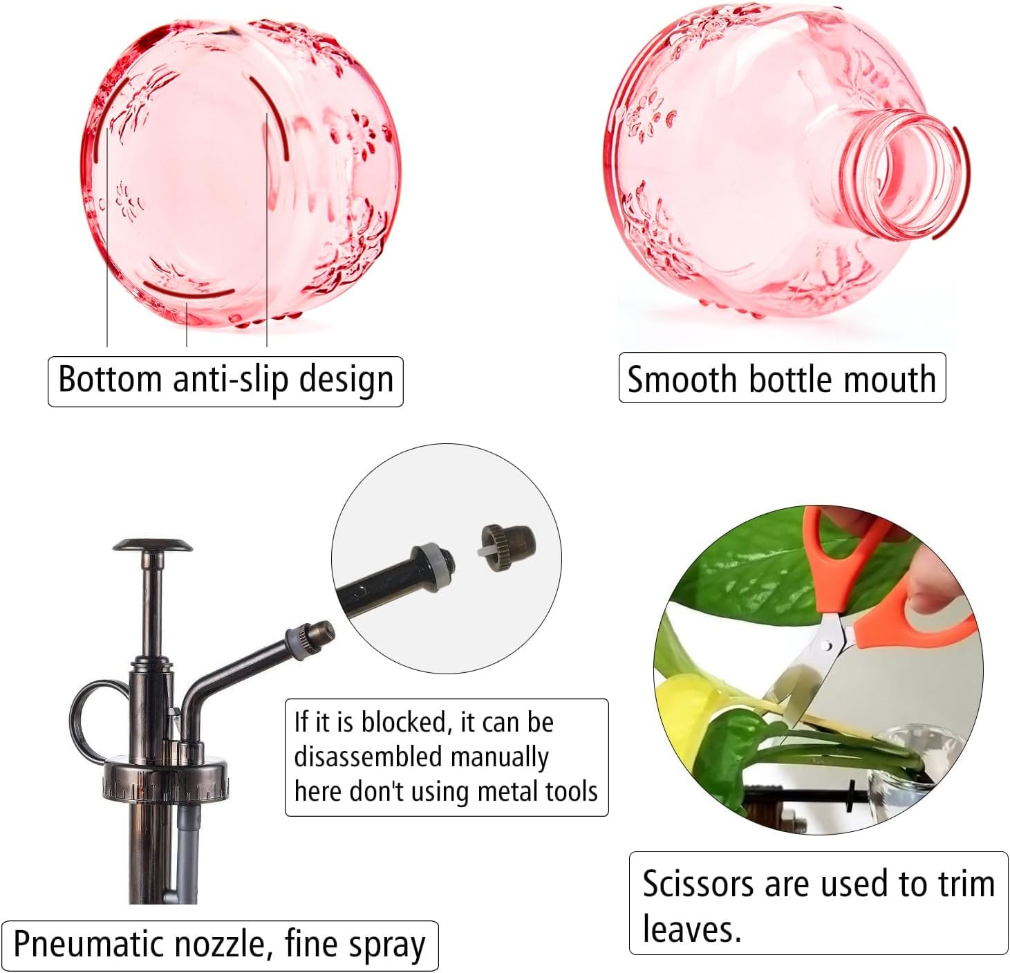 - Material: The bottle is made of high quality thick transparent glass, which is sturdy, durable and can’t easily break. The top pump is plastic with metallic paint which prevent rust and fading color. the pneumatic nozzle design of the plant atomizer creates a ultra fine mist.