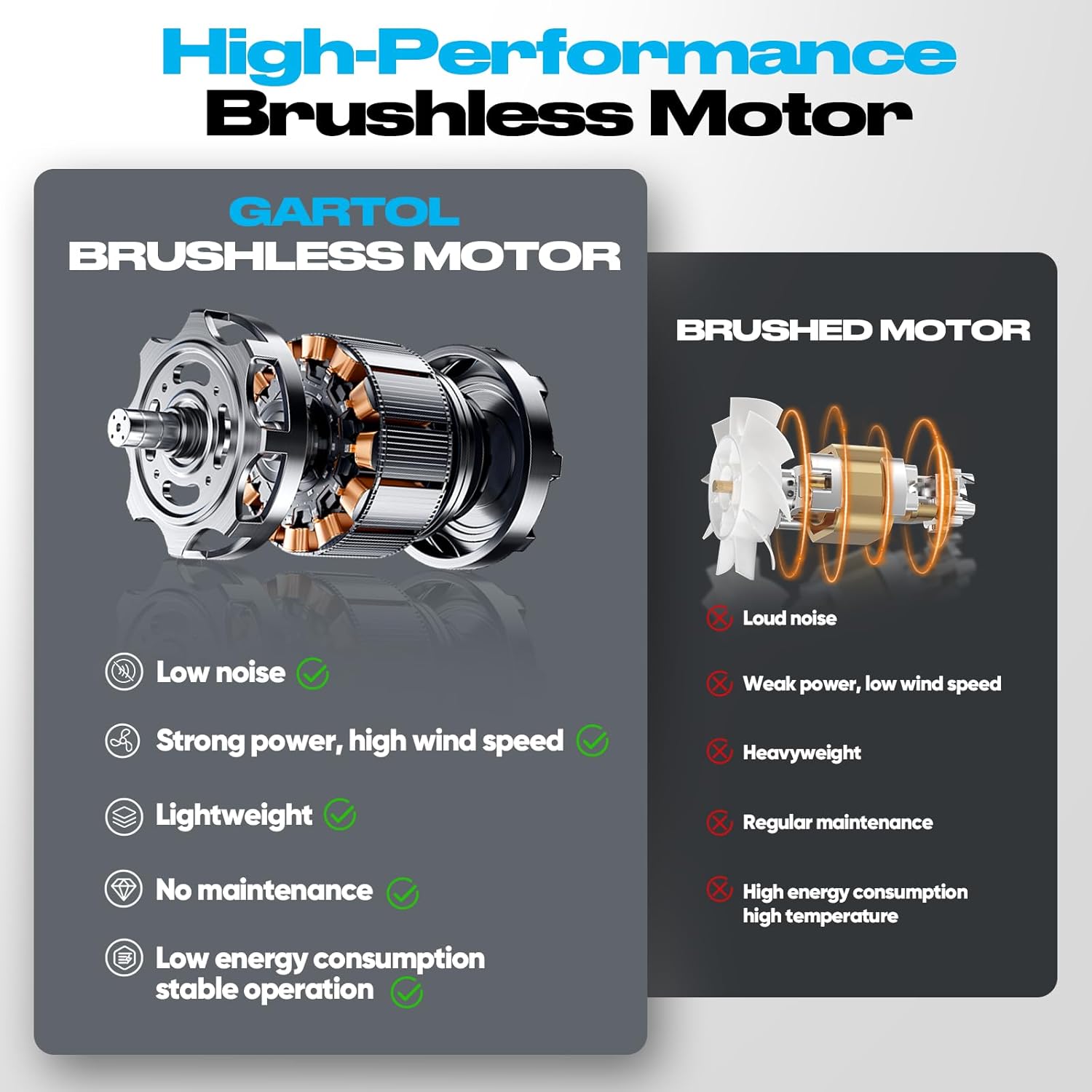 - [Super Powerful Cordless Blower with Brushless Motor] The GARTOL cordless leaf blower features a high-powered brushless motor, delivering up to 600 CFM and 190 MPH wind speed. Unlike traditional models, this electric blower offers high efficiency, stable airflow, and a longer lifespan—perfect for those seeking a super powerful cordless blower. Ideal for all-season blowers for lawn care, heavy-duty garden tasks, and outdoor cleanup