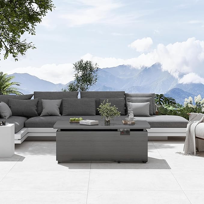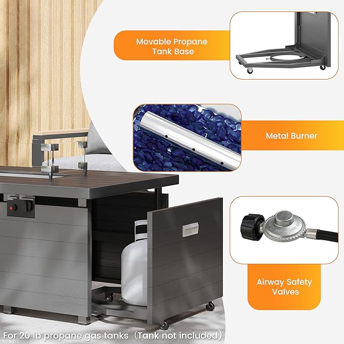 - User-Friendly Propane System & Smart Features: The convenient removable base accommodates standard 20-lb propane tanks (not included) for easy fuel changes. Thoughtful design elements include accessible controls, proper ventilation, and generous table space (51" L) for drinks and decor when used as a coffee table.