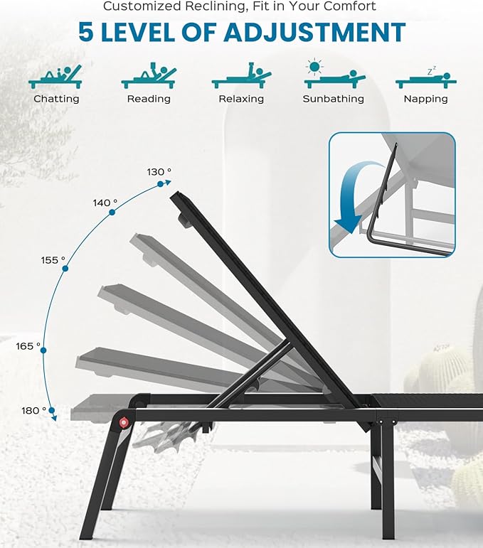 - 5-Position Adjustable Backrest - Experience ultimate comfort with our patio lounge chair’s five recline options. Whether you’re reading, napping, or simply relaxing, adjust the backrest from upright to fully reclined to find your perfect angle