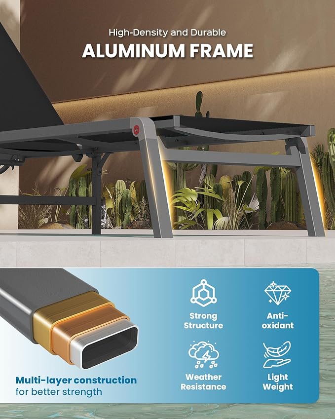 - Rust-Resistant Aluminum Frame - Built with a durable aluminum frame covered in an anti-rust powder coating, this pool lounge chair withstands outdoor elements. Its robust design provides longevity and low maintenance for carefree outdoor relaxation