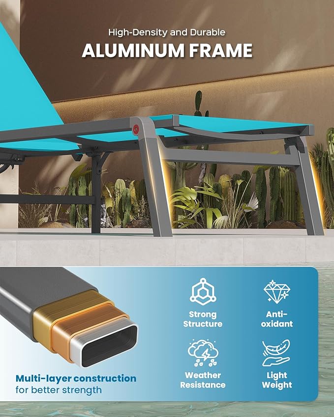 - Rust-Resistant Aluminum Frame – Built with a durable aluminum frame covered in an anti-rust powder coating, this pool lounge chair withstands outdoor elements. Its robust design provides longevity and low maintenance for carefree outdoor relaxation