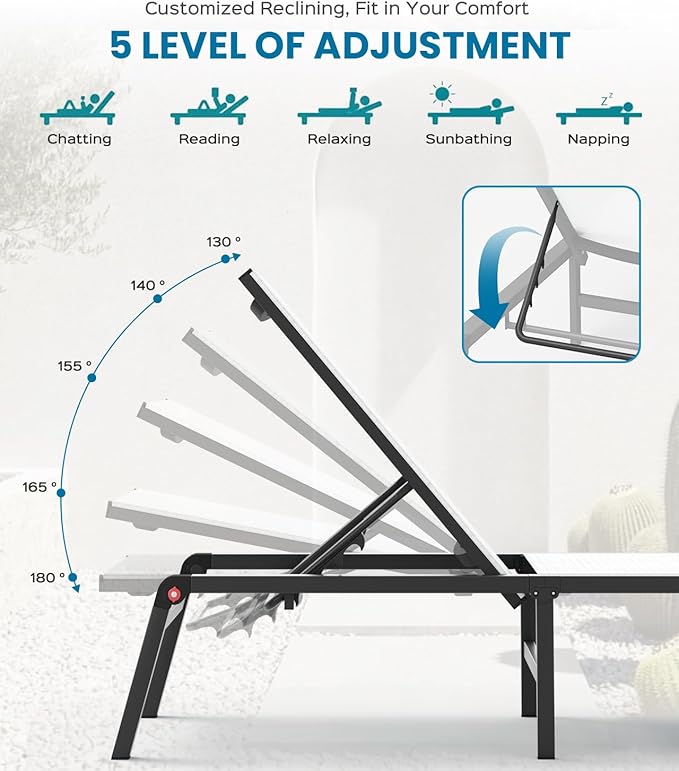 - 5-Position Adjustable Backrest - Experience ultimate comfort with our patio lounge chair’s five recline options. Whether you’re reading, napping, or simply relaxing, adjust the backrest from upright to fully reclined to find your perfect angle