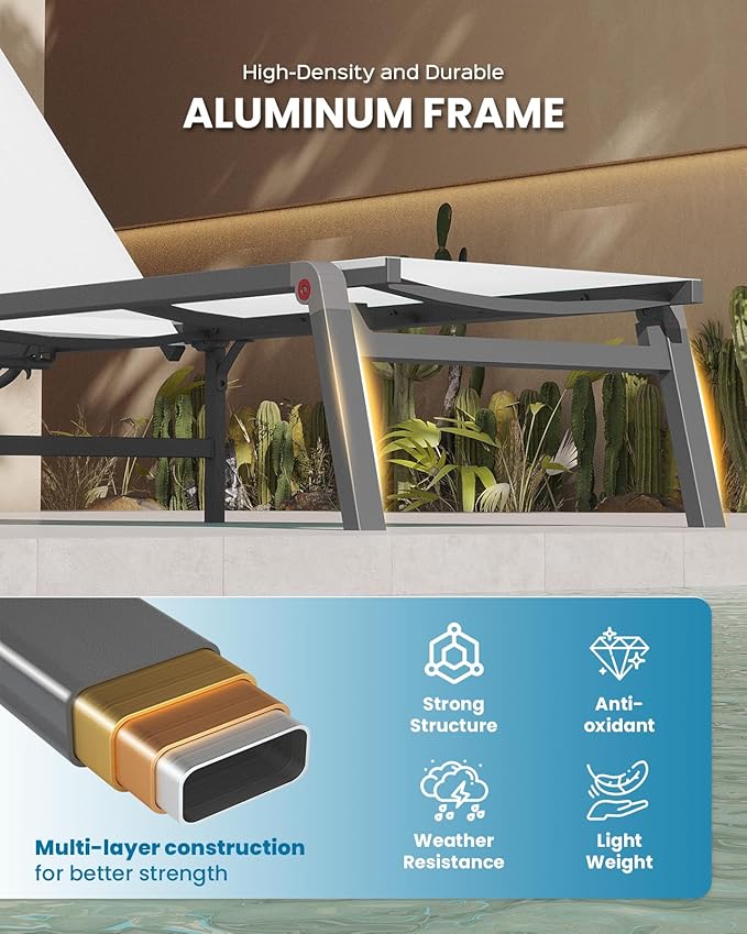 - Rust-Resistant Aluminum Frame - Built with a durable aluminum frame covered in an anti-rust powder coating, this pool lounge chair withstands outdoor elements. Its robust design provides longevity and low maintenance for carefree outdoor relaxation
