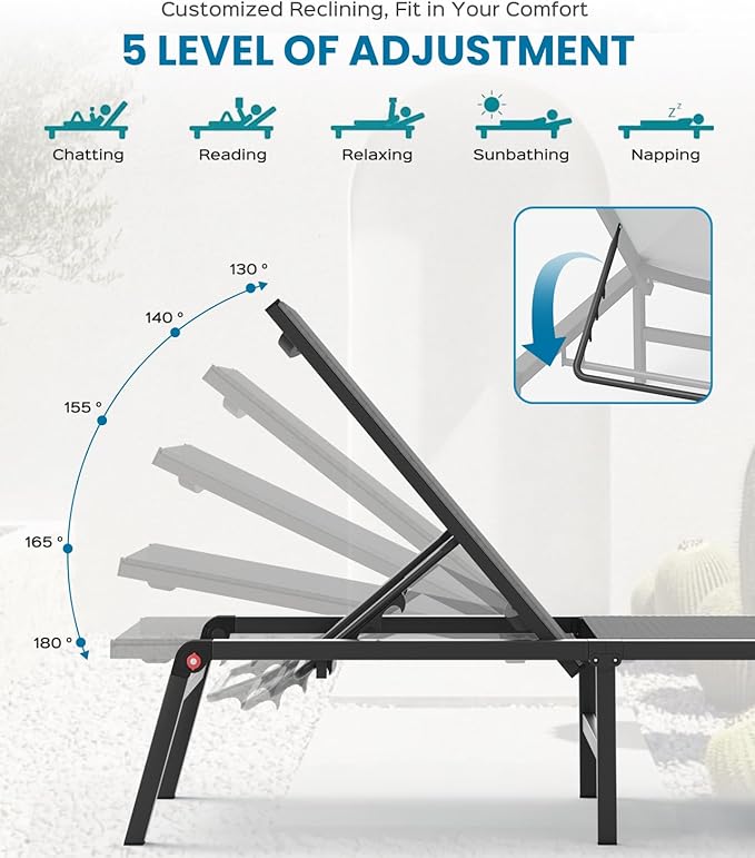- 5-Position Adjustable Backrest - Experience ultimate comfort with our patio lounge chair’s five recline options. Whether you’re reading, napping, or simply relaxing, adjust the backrest from upright to fully reclined to find your perfect angle