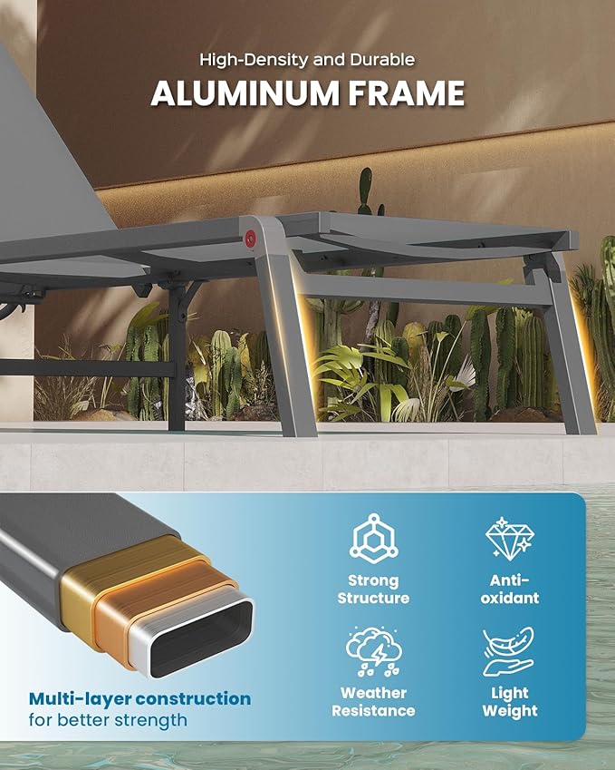 - Rust-Resistant Aluminum Frame - Built with a durable aluminum frame covered in an anti-rust powder coating, this pool lounge chair withstands outdoor elements. Its robust design provides longevity and low maintenance for carefree outdoor relaxation