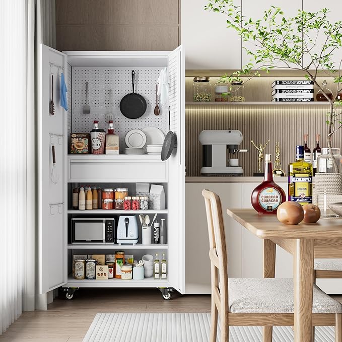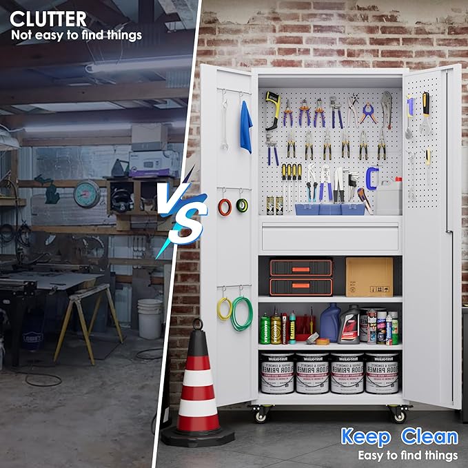 - 【4 Adjustable Shelves & 1 inside drawer】 Locking cabinet on wheels has 4 adjustable shelves,The 2 pegboard on the backboard can be used as adjustable shelves. The shelves can be adjusted up and down to the desired position for your household items, tools, and other items. 71inch tall storage cabinet has 1 inside drawer, You can store important tools and screws in it. The drawer is carried by two silent tracks, allowing for comfortable pulling.