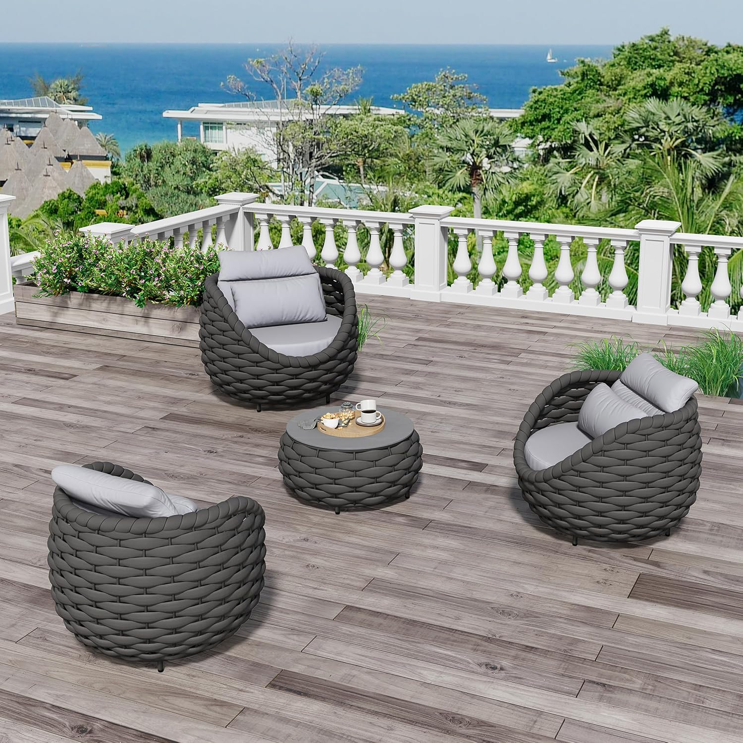 - Woven rope patio set includes: 3*single armchairs, 1*coffee table. Size: Single chair: 34.3''(L)X34.3''(W)X27.6''(H) holds up to 400 lbs/181.5kg; Side table: 28.4''(L)X28.4''(W)X14.2''(H) holds up to 176 lbs/80kg. Color: Dark gray rope and gray fabric