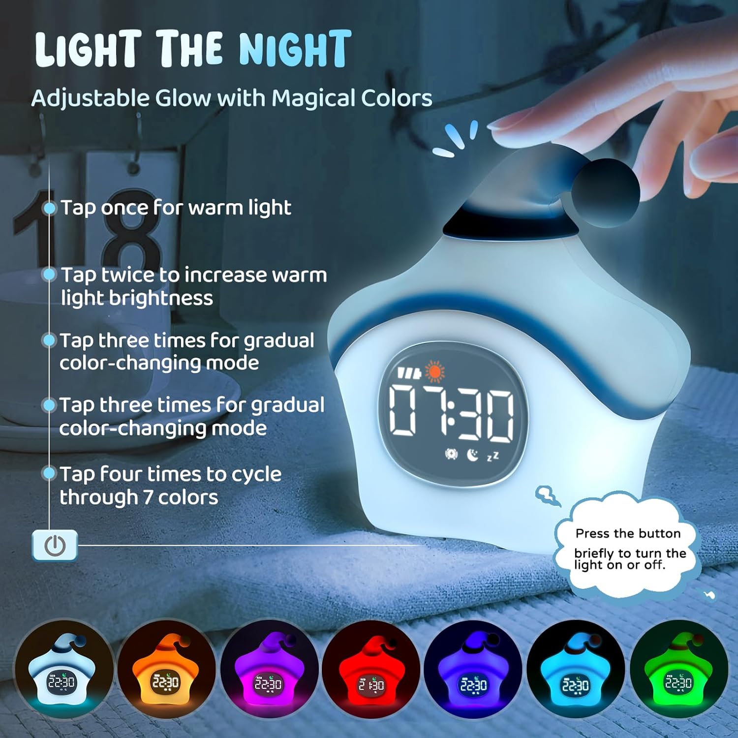 - Multi-Mode Night Light – Tap the kids alarm clock body to cycle through two brightness levels, a gradual transition mode, and a fun seven-color option. Eye-safe LED lighting creates a cozy bedtime environment while doubling as playful ambiance lighting.