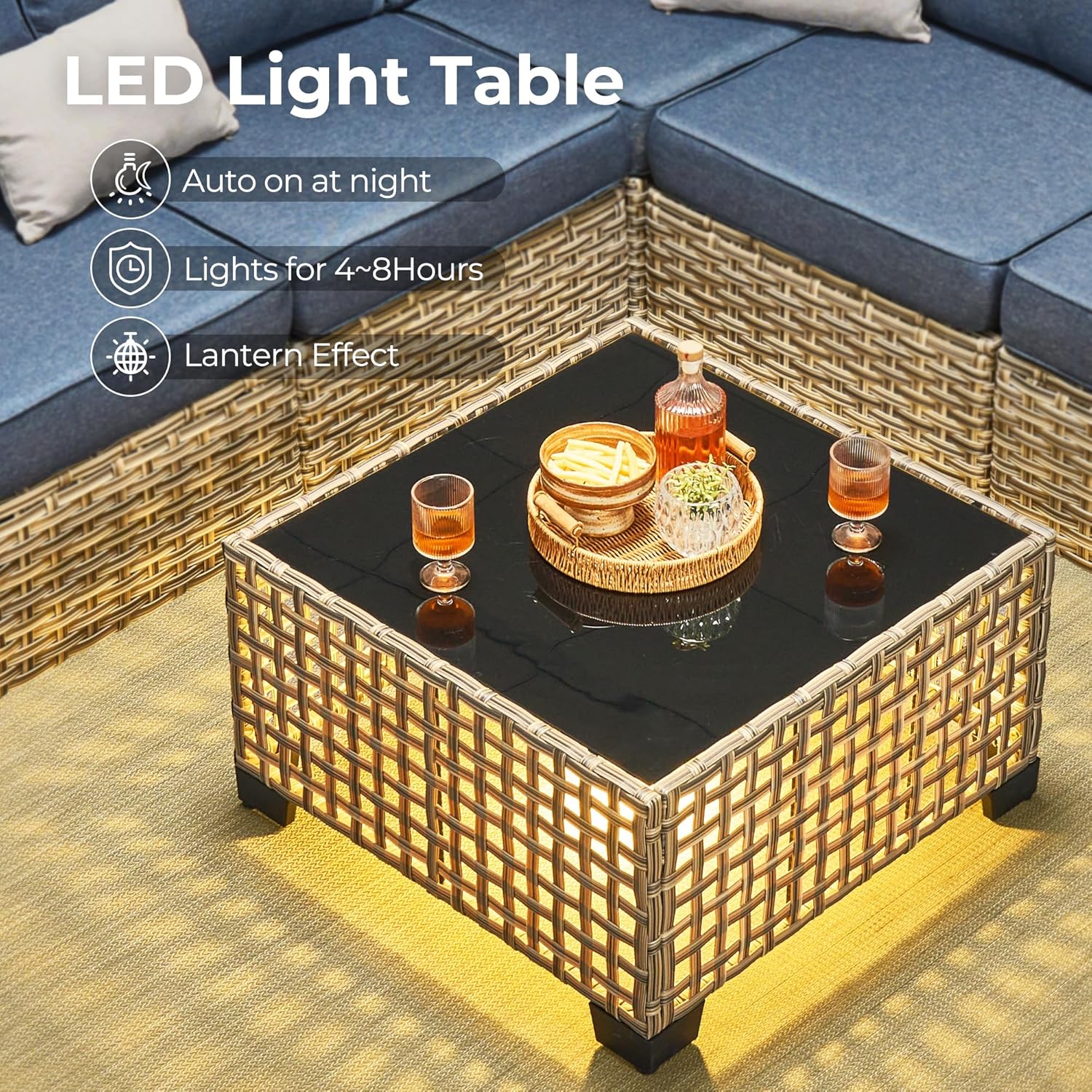 HOOOWOOO Outdoor Sectional Patio Furniture Set with Fire Pit Table,13 Pieces Wicker Conversation Sets L Shaped Couch,Extra Deep Out Door Sofa Outside Furniture with Swivel Chairs Ottoman,Denim Blue
