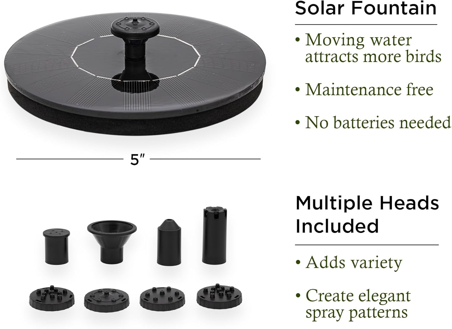 - INCLUDES SOLAR WATER FOUNTAIN and MULTIPLE HEADS - create varying water effects with the fountain heads. Simple overflow or tall bursts of water - you'll love it as much as the birds. No batteries needed - you only need sunlight for the fountain to work.