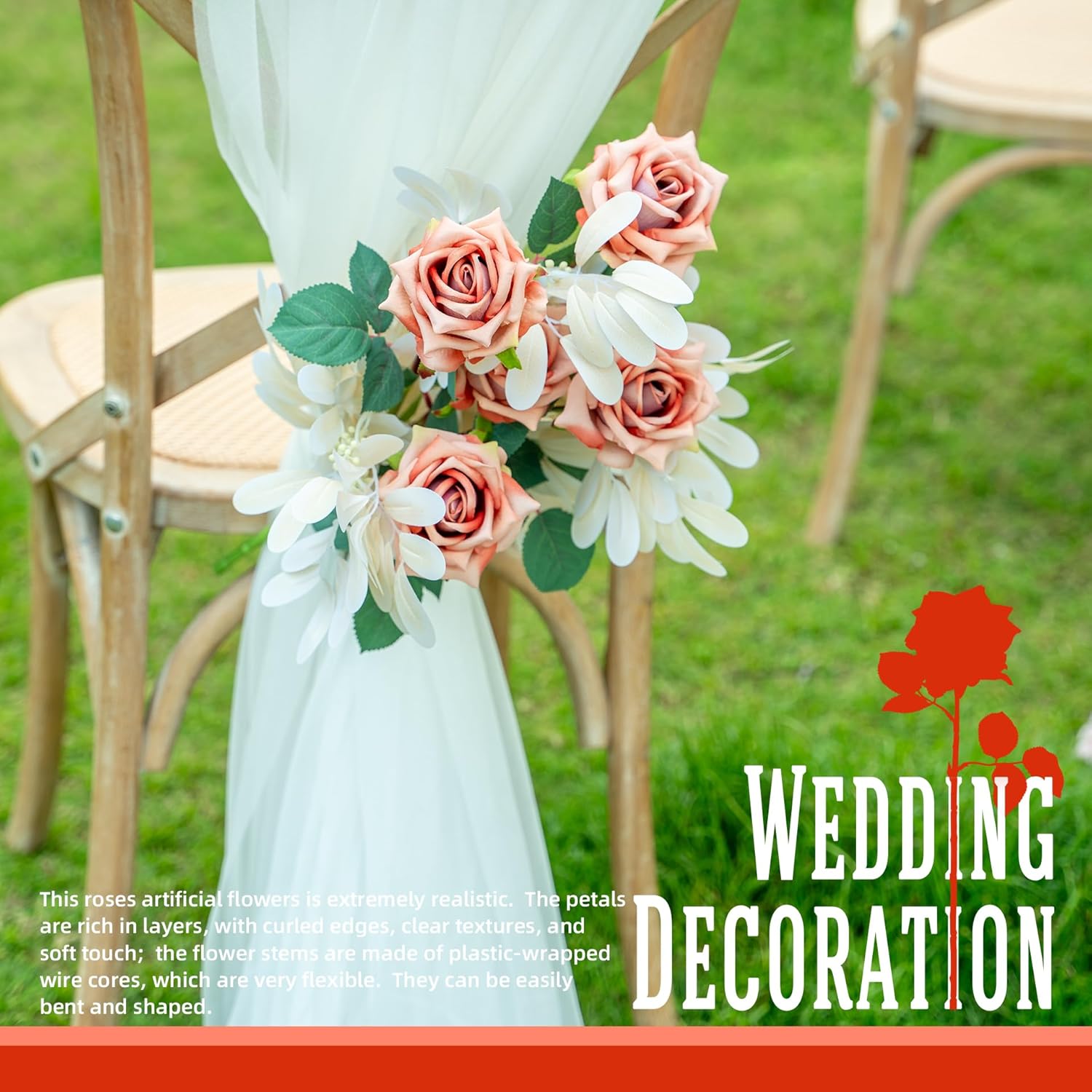 - Details: This roses artificial flowers is extremely realistic. The petals are rich in layers, with curled edges, clear textures, and soft touch; the flower stems are made of plastic-wrapped wire cores, which are very flexible. They can be easily bent and shaped. The color transition of the flower stems is natural, with subtle concave and convex textures and moderate hardness.