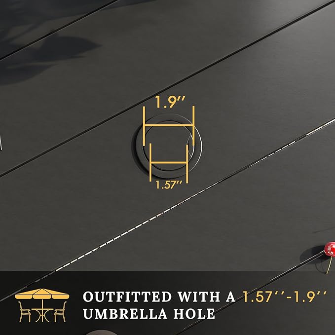 - 【Patio Dining Table】Patio round table set features a powder-coated frame, the bent leg design serves better stability and greater aesthetics, outfitted with an adjustable umbrella hole (1.57" -1.9", hole cover included), opening to secure an umbrella to protect your food and guests from the bright sun