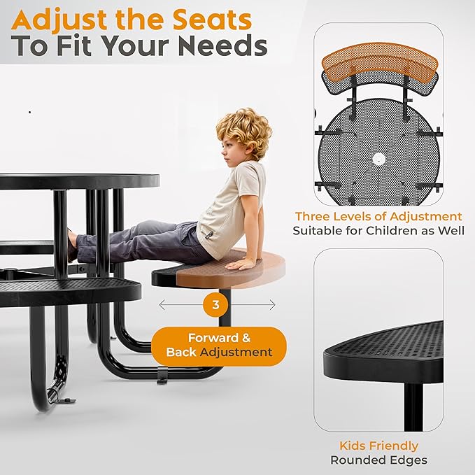 - Designed for Decades of Outdoor Use: Round outdoor picnic table crafted from industrial-strength steel and thick coated in thermoplastic for rust-free, long-lasting quality. Sturdy steel frame with powder-coat finish resists harsh weather, making it the definition of a weather proof table.