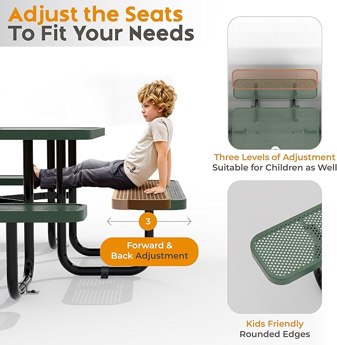 Metal Picnic Tables for Outdoors with Umbrella Hole - Coated Steel Heavy Duty Commercial Grade Table with Adjustable Seats (Green, 46 in, Square, Punched Steel)