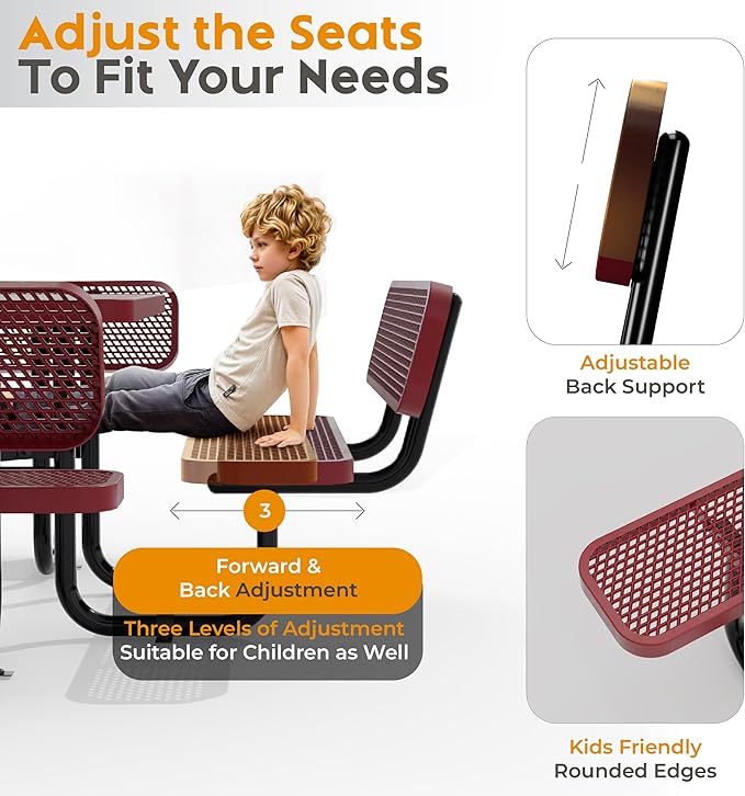 Metal Picnic Tables for Outdoors with Umbrella Hole - Coated Steel Heavy Duty Commercial Grade Table with Adjustable Seats (Red, 46 in, Square with Back, Expanded Steel)