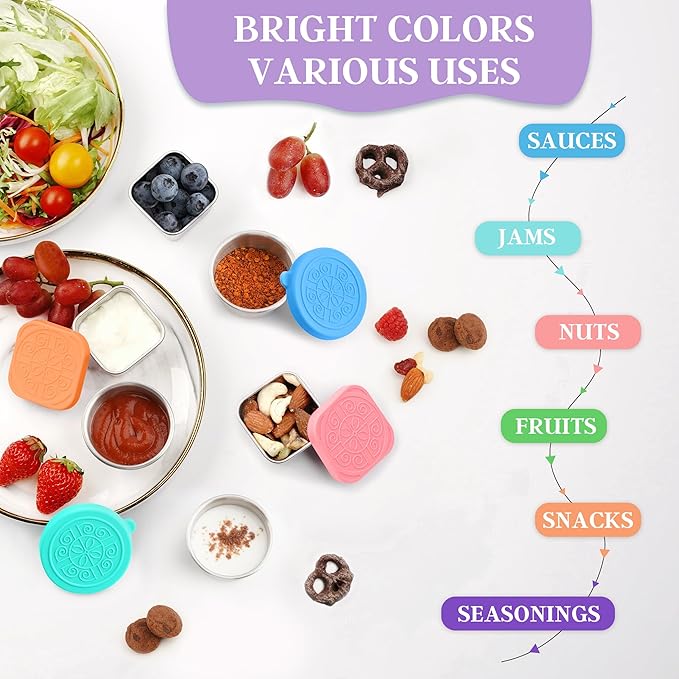 - 【EASY-OPEN COLORFUL LID】: The soft silicone lid of the sauce cups is not only cute, but also very easy to put on and take off. The colorful silicone lid set not only accommodates a variety of preferences, but can also be used to easily differentiate between different sauces in the container, making your meal prep and kitchen storage more convenient