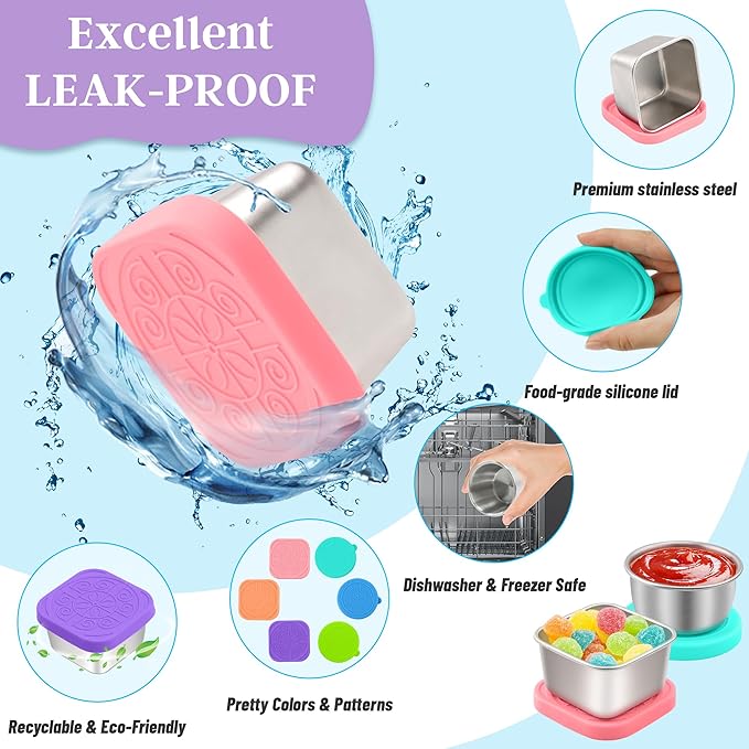- 【SAFE AND RELIABLE MATERIAL】: The small container with lid is made of quality 304 stainless steel and food-grade safe silicone, which makes our sauce cup non-toxic, dishwasher safe, freezer safe and durable enough for long-termism lifestyle. Our salad container for lunch can completely replace disposable containers, reduce the use of plastic and achieve environmental protection