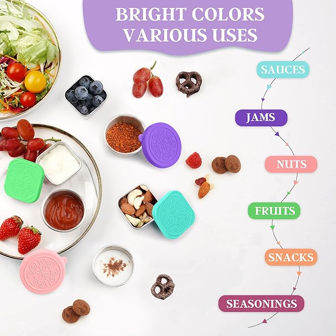 - 【EASY-OPEN COLORFUL LID】: The soft silicone lid of the sauce cups is not only cute, but also very easy to put on and take off. The colorful silicone lid set not only accommodates a variety of preferences, but can also be used to easily differentiate between different sauces in the container, making your meal prep and kitchen storage more convenient