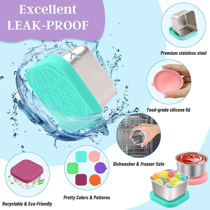 - 【SAFE AND RELIABLE MATERIAL】: The small container with lid is made of quality 304 stainless steel and food-grade safe silicone, which makes our sauce cup non-toxic, dishwasher safe, freezer safe and durable enough for long-termism lifestyle. Our salad container for lunch can completely replace disposable containers, reduce the use of plastic and achieve environmental protection