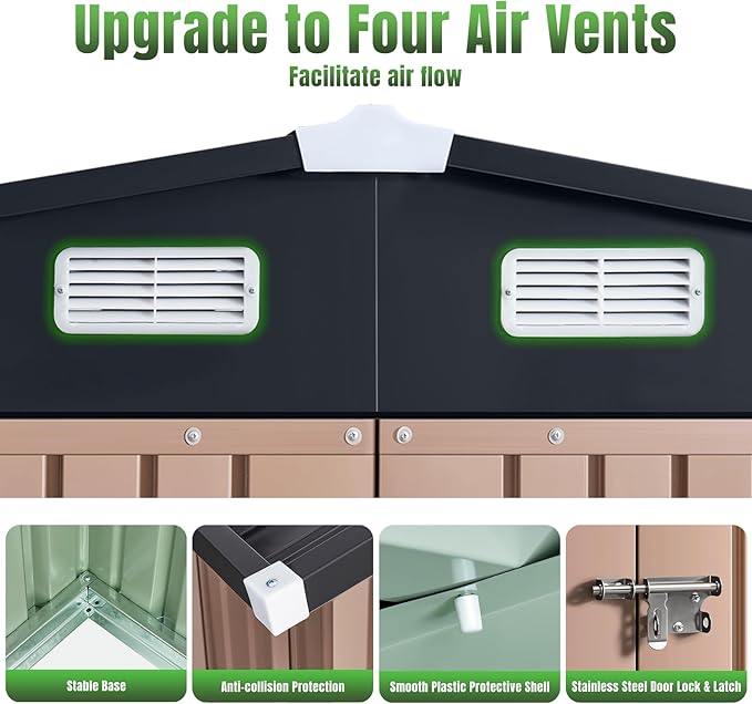 - Heavy-Duty Construction for All-Weather Durability: Built to last, this storage shed features a galvanized steel frame with a powder-coated finish, offering superior rust resistance and UV protection. The rigidly engineered panels withstand heavy loads and adverse weather, while the integrated top vents promote airflow, reducing condensation. The sloped roof design enhances water runoff, and the stainless steel latch lock secures your belongings from theft and pests.