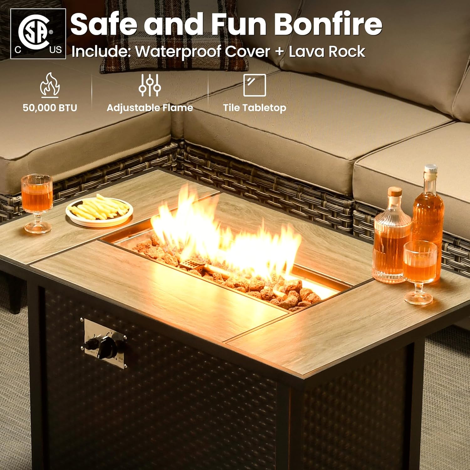 - Outdoor Fire Pit Table: 42 inches gas propane fire table has 55000 BTU powerful heat output with CSA certification to make sure the quality and safety are excellent for you to use. Creating a warm and romantic bonfire atmosphere. Equipped with a flame adjustment device, the simple switch control panel