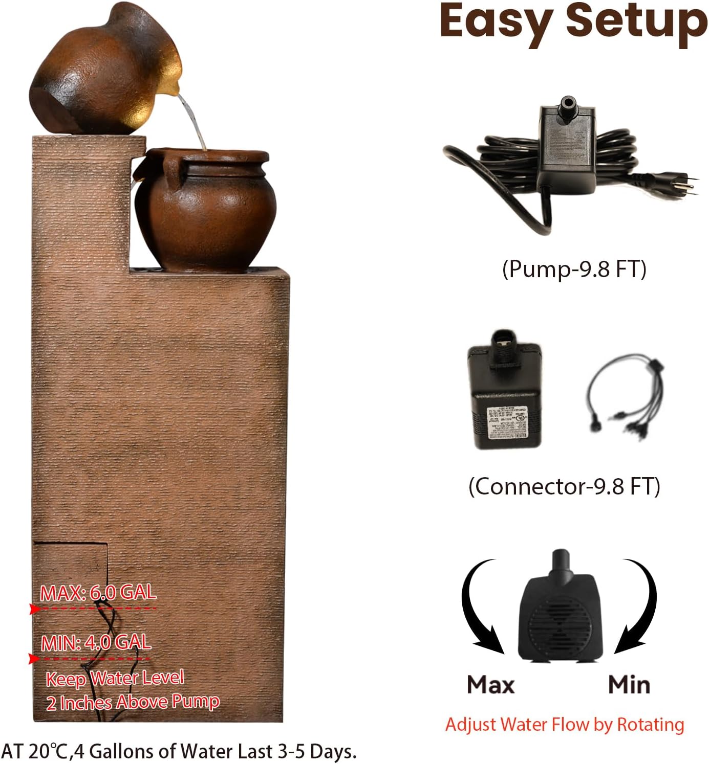 - SIZE & PACKAGE: The 18.5"L x 14.6"W x 53"H tall water fountain package includes: patio water fountain (39 lbs)1, transformer with 9.8 ft power cord*1, pump*1, and instruction manual*1. The outdoor fountain and waterfall are easy to set up, maintain, and clean — an excellent choice for decorating your outdoor living space