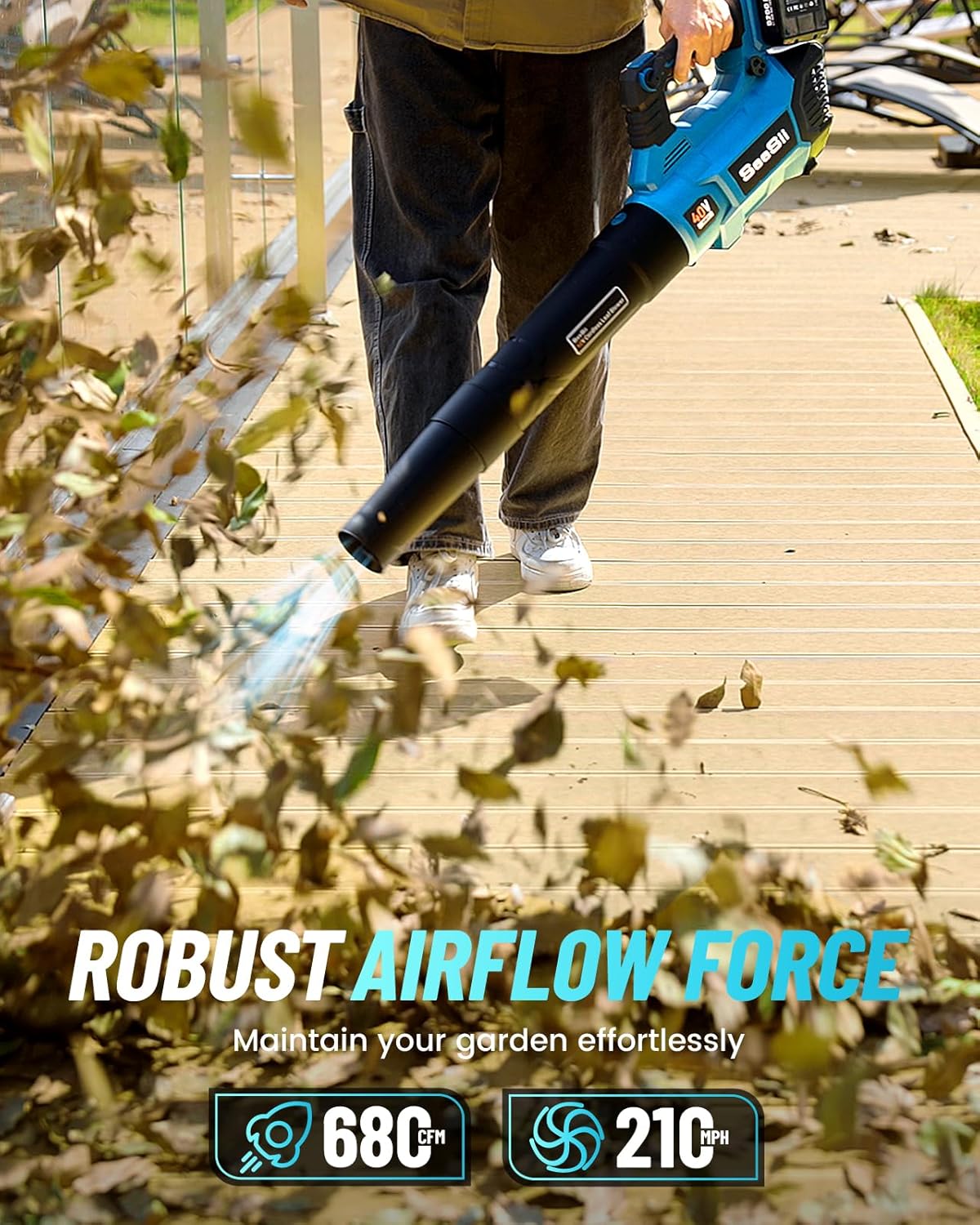 - Powerful Airflow for Efficient Clearing: SEESII 40V leaf blower cordless is designed with up to 680 CFM and wind speeds of 210 MPH, the powerful airflow easily blows away heavy wet leaves, clears debris and dust from lawns, and even sweeps away small stones, making it ideal for tackling a wide range of outdoor cleaning tasks.