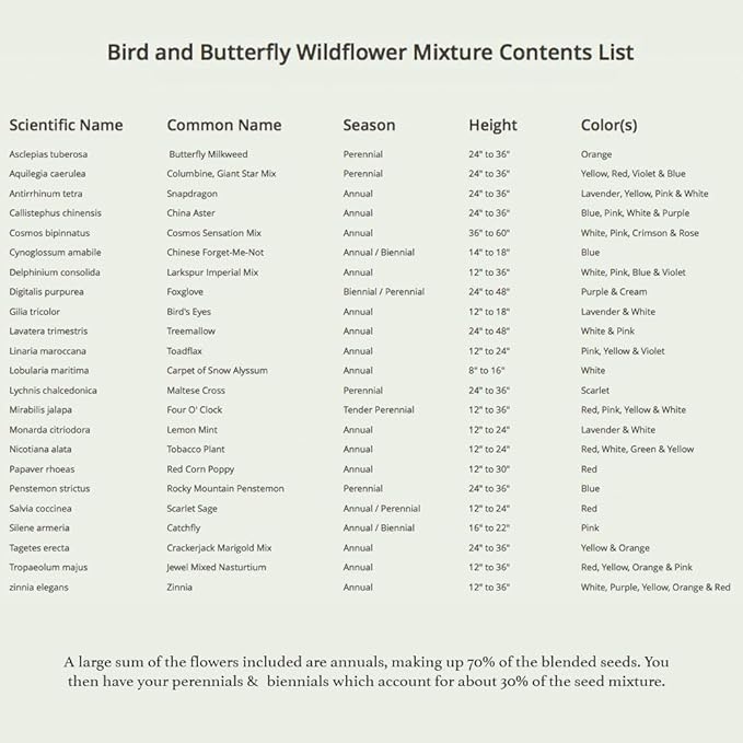 - Perennial Flower Seeds: Our Butterfly Mix contains a few perennial / tender perennial flower seeds, such as butterfly milkweed seeds, giant star columbine seeds, maltese cross seeds, scarlet salvia seeds & four o' clock seeds.