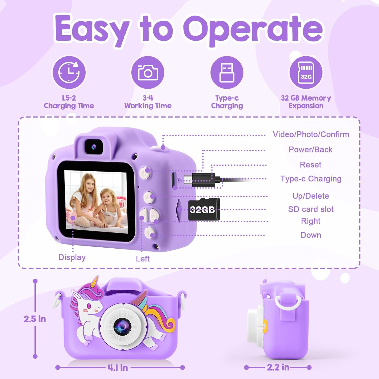 - Built-In High-Capacity Battery & Type-C Charging & 32GB Card: Kids camera can shoot continuously for 3-4 hours after being fully charged! No more worries about your camera running out of battery outdoors. The kids digital camera comes with a 32GB card that can store over 6,000 photos, so kids can shoot anywhere and anytime without worrying about running out of memory.