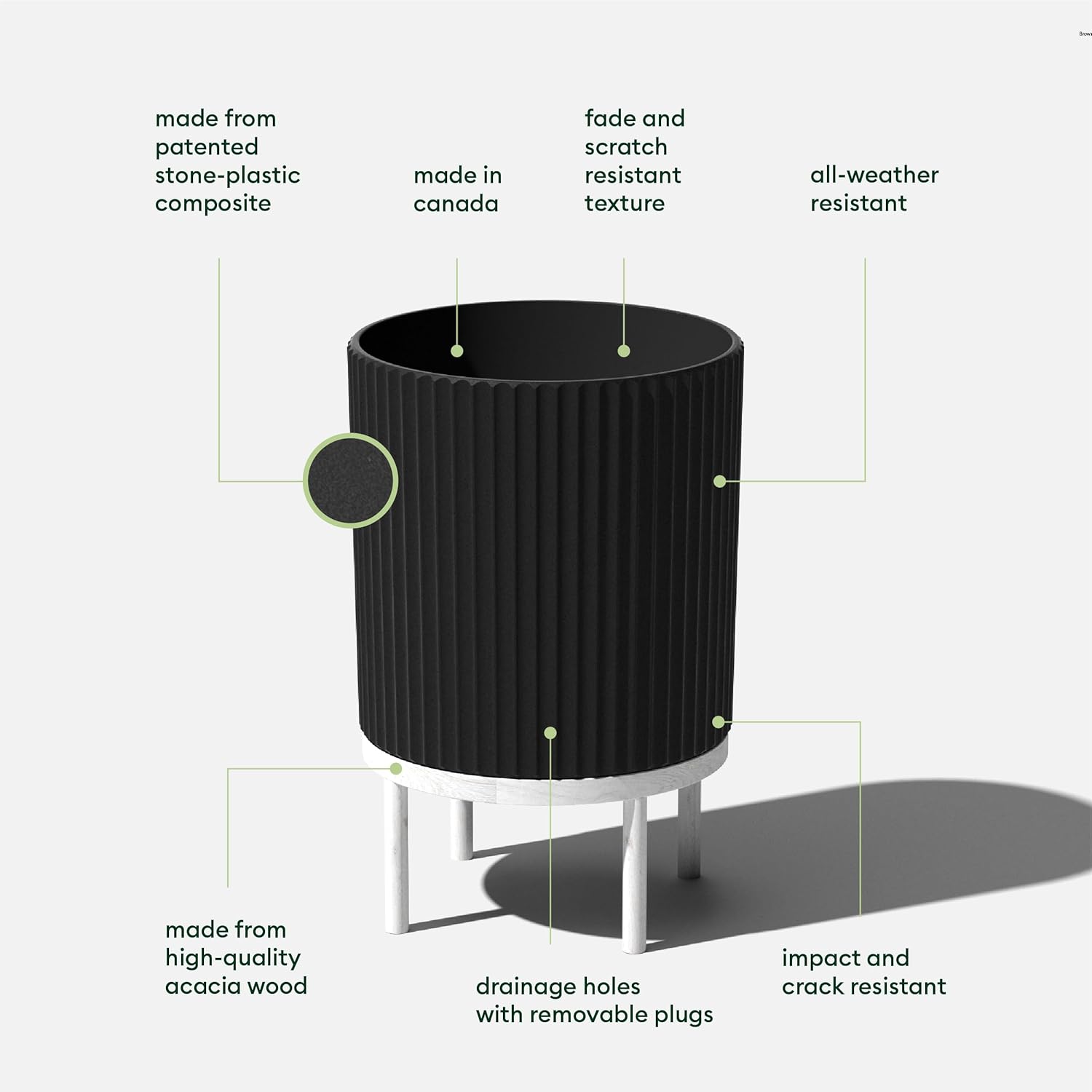 - Material : Plastic-stone composite planter & Acaia wood stand