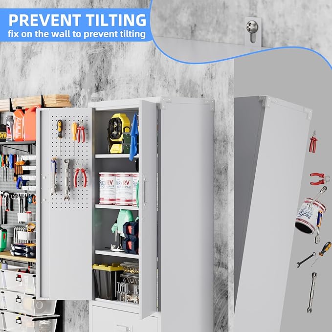 - 【Upgraded Magnet Attraction & Pegboard Function 】Magnetic suction is installed on the top and bottom of the cabinet, so the door can be closed better, increasing safety and neatness.The pegboard function adds additional vertical storage space,metal garage storage cabinet with wheels can be used in a variety of places and occasions, such as home, garage, school, office and so on.