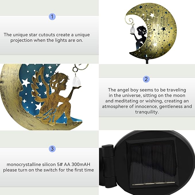 - Unique Celestial Design: The solar garden stake light features a serene angel resting on a crescent moon, surrounded by twinkling stars and a crystal pendant in hand, symbolizing peace, hope, and spiritual light; it adds a spiritual touch to your garden