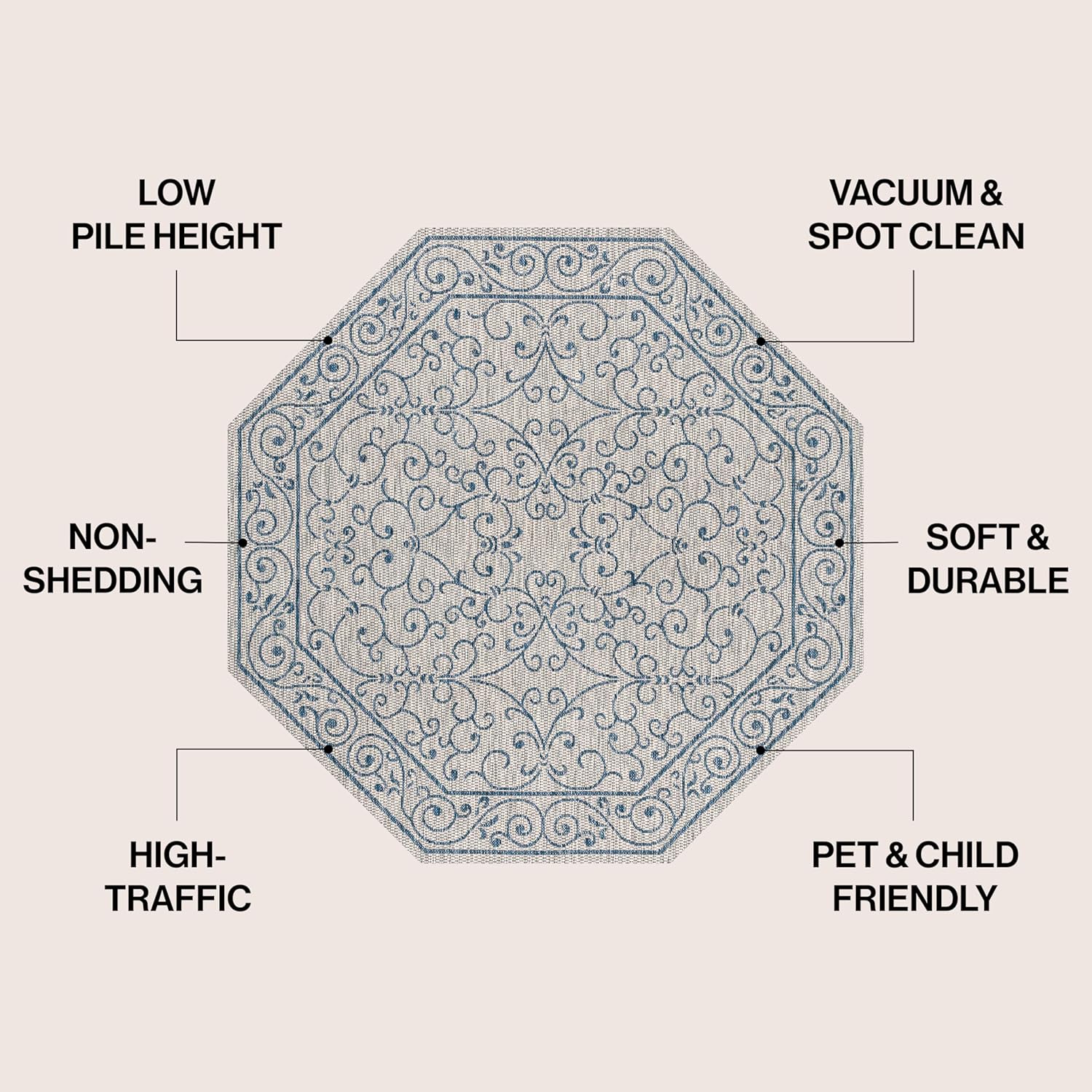 JONATHAN Y SMB106C-5TGN Charleston Vintage Filigree Textured Weave Gray/Navy 5' Octagon Indoor/Outdoor Area Rug, Non-Shedding, Stain Resistant,Fade Resistant, Easy-Cleaning for Backyard Patio, Porch