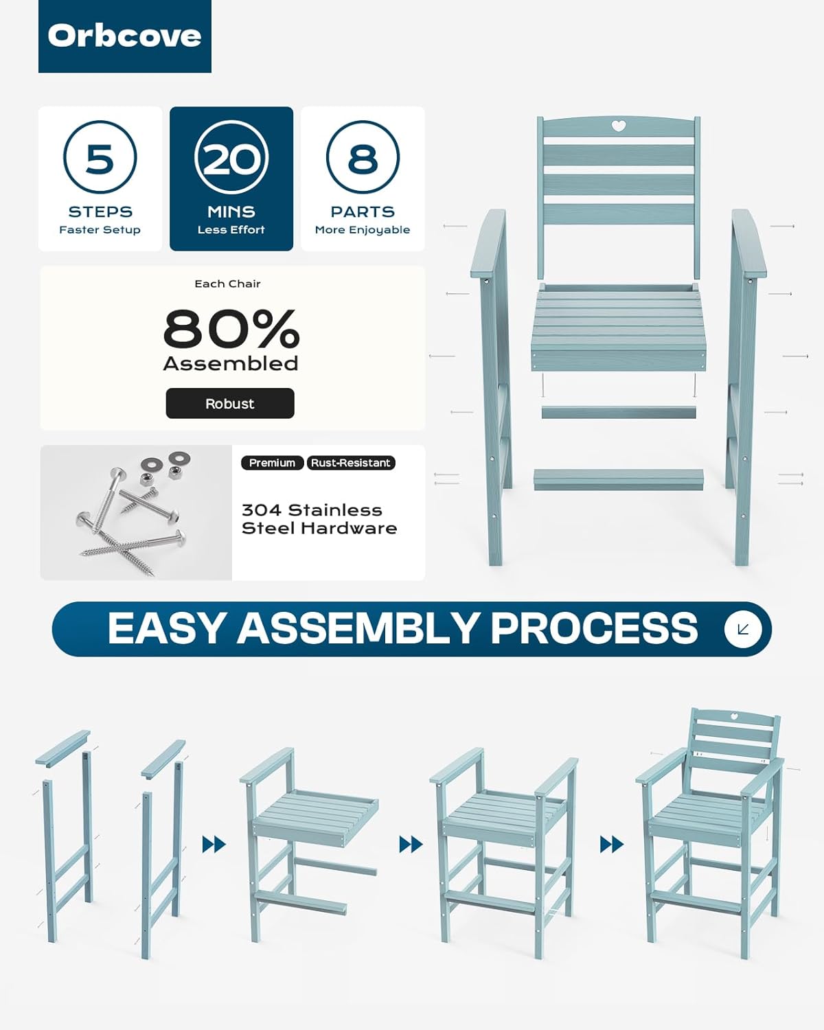 Tall Adirondack Chairs Set of 2, HDPE Wood Balcony Adirondack Chairs Set with Heart Cutout Design, Weather-Resistant Bar Height Furniture for Deck, Porch, Pool (Light Blue)