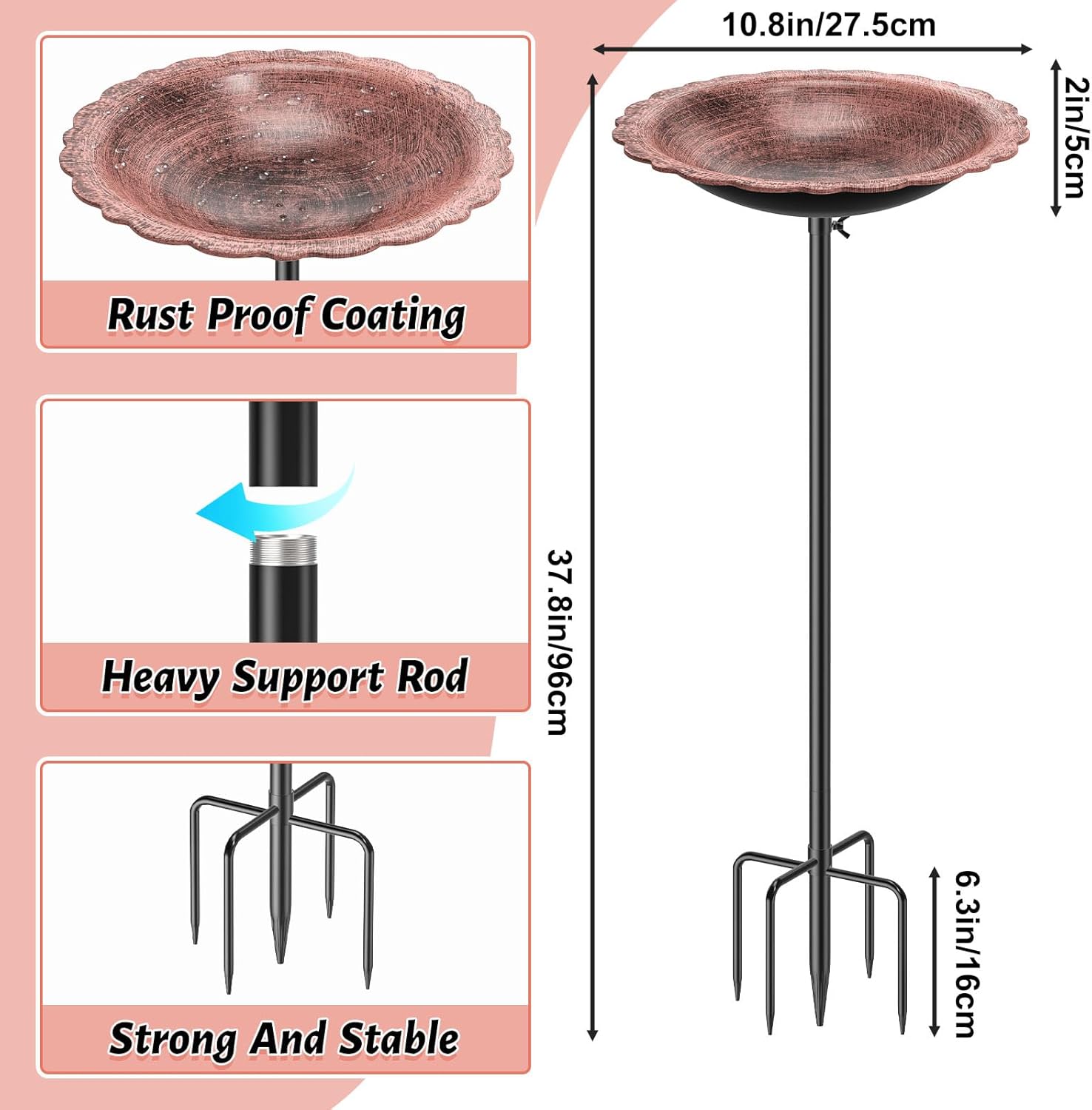 - Bright colors:The vintage copper color beautiful and elegant easily attracts birds for bathing and complements the flowers and plants, creating a more natural and pleasant environment. It’s sure to become a striking focal point in your outdoor space