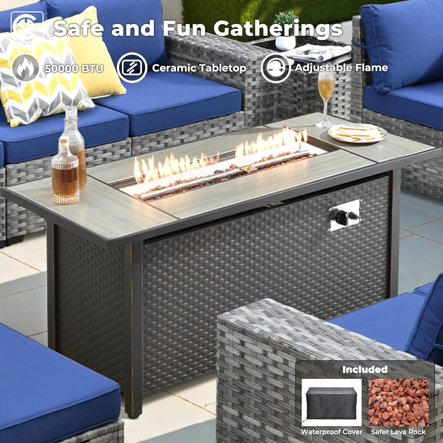 - Outdoor Fire Pit Table: 54 inches rectangular gas propane fire table has 55000 BTU powerful heat output with CSA certification to make sure the quality and safety are excellent for you to use. Creating a warm and romantic bonfire atmosphere. Equipped with a flame adjustment device, the simple switch control panel.