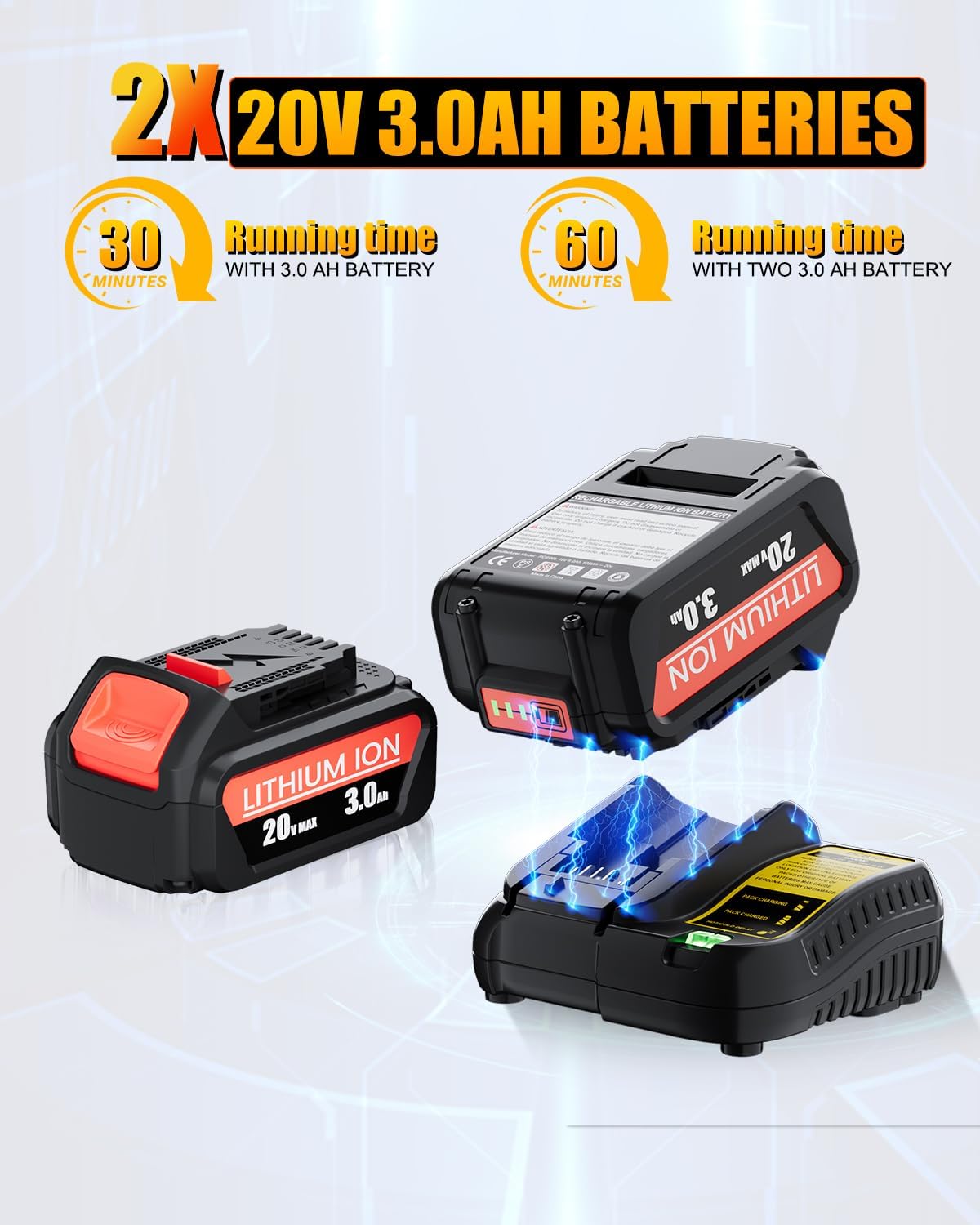 - Package Contents & Warranty:The package includes:1x leaf blower body, 1x blow tube, 1x extension nozzle, 2 x 20V 3.0Ah batteries, 1x fast charger, 1x user manual. Backed by a 12-month warranty. If you encounter any issues, feel free to contact us—we’ll respond within 24 hours to ensure your satisfaction.