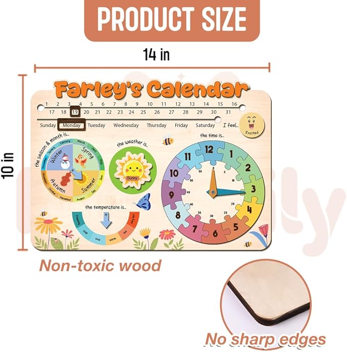- KID'S ROOM DECOR: With its cute design and non-toxic natural wood material, our wooden calendar can also be used as a decoration for children's playrooms, classrooms or bedrooms. This wooden calendar is a meaningful tool that combines fun and learning, perfect to explore the world around.