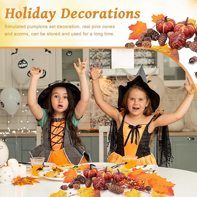 - Artificial Pumpkins Set: 30pcs pumpkin set includes 4pcs pumpkins, 18pcs pine cones, 6pcs maple leaves, and 2pcs fruit branches, it has several sizes and color. Artificial pumpkins set can add a strong festive atmosphere to your home, Meet your decoration requirements Artificial pumpkins set create an instant arrangement for display ,for your fall Harvest ,Thanksgiving and Halloween or home decor.