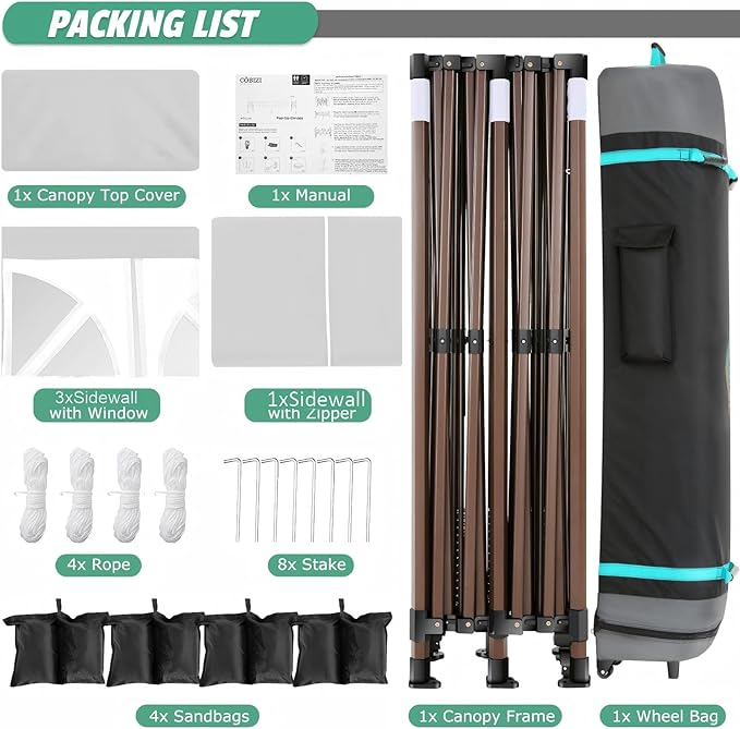 - [Included Accessories, Warranty Service] 1x Commercial Grade 10x15 Pop Up Tent Frame, 1x 420D Top Cover, 3x Window Sidewalls, 1x Double Zipper Door Sidewall, 8x Ground Pegs, 4x Windproof Ropes, 1x 1080D Rolling Bag, 1x Manual.We provide 1 year warranty service. If you have any problems and questions, please feel free to contact us, we will give you the best help. Choosing us means choosing a comfortable life.