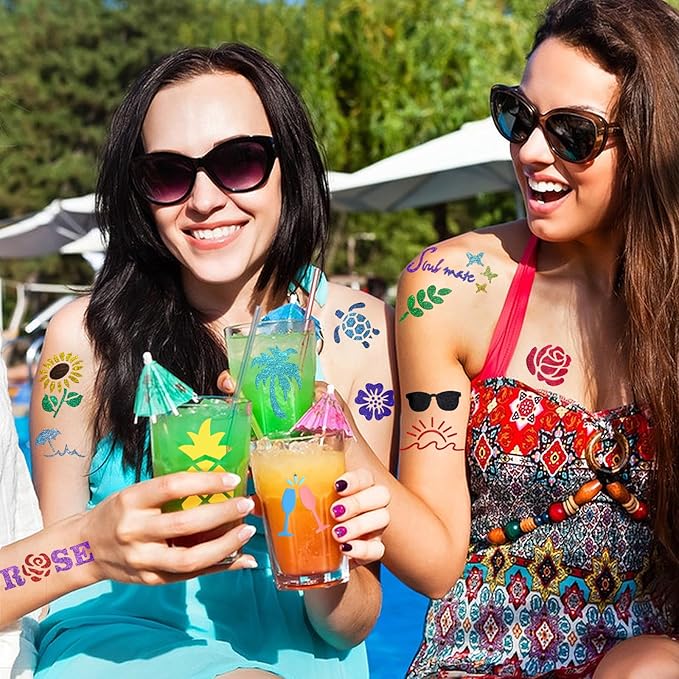 - 167 PCS Different Styles Tattoos Stencil: Our temporary tattoo stencils sheet comes with 167 different design such as Rainbow, wine glass, duck, swimsuit, turtle, footprints, sunflower, flower, pineapple, four-leaf clover, butterfly, ice cream, cake, candy, hot air balloon, seahorse, sunglasses, seaweed, guitar, starfish, seaweed, sunnday, sun, wind chime, dolphin, crown, bee, surfing, watermelon, slippers, shellsand more Style in 12 sheets A5 size tattoo template suitable for summer. Perfect for festivals, parties, or daily fashion.