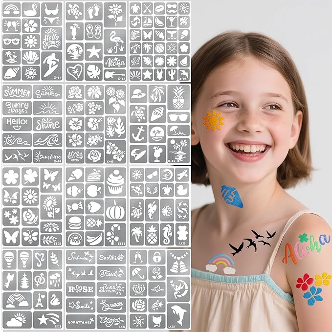 - Perfect Gift for All Ages: Great for teens, adults, or artists. Includes practice sheets and a guide for flawless results every time. Perfect for Glitter Tattoos / Henna Tattoo/ face paint crayons/face paint brushes/ Body Art/ Temporary Tattoo Ink for both kids and adults. our body art stencils will sure get the kids excited.